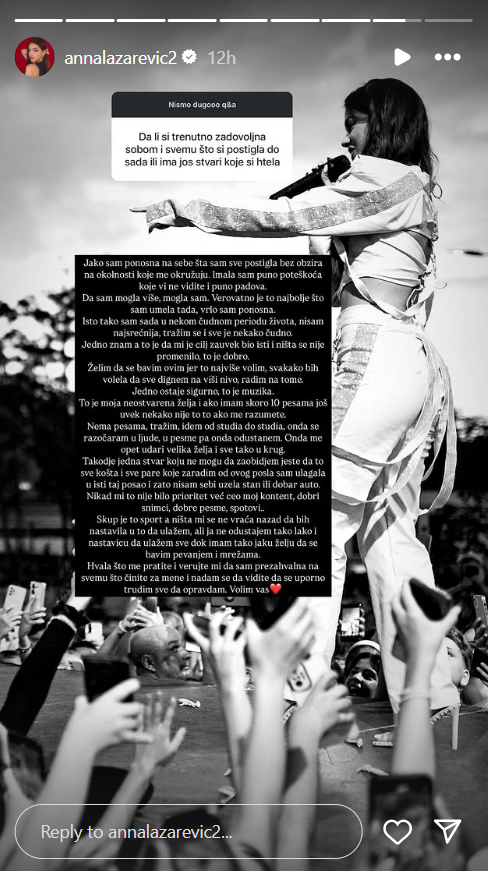 „Jako sam ponosna na sebe šta sam sve postigla bez obzira na okolnosti koje me okružuju. Imala sam puno poteškoća koje vi ne vidite i puno padova. Da sam mogla više, mogla sam. Verovatno je to najbolje što sam umela tada, vrlo sam ponosna. Isto tako sam sada u nekom čudnom periodu života, nisam najsrećnija, tražim se i sve je nekako čudno. Jedno znam, a to je da mi je cilj zauvek bio isti i ništa se nije promenilo, to je dobro. Želim da se bavim ovim jer to najviše volim, svakako bih volela da sve dignem na viši nivo, radim na tome“, napisala je ona na početku, pa se osvrnula i na svoju muzičku karijeru.