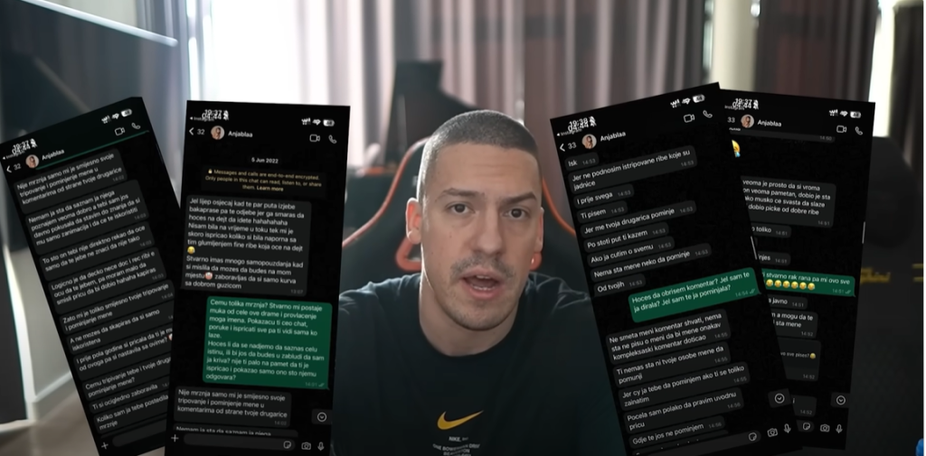 „Anja poseduje mržnju prema mojoj devojci zato što smo se mi viđali u periodu kada smo raskinuli Anja i ja 2022. godine. Ali, ja sam se viđao sa mnogim devojkama tada i nijedna, po Anjinom, nije zaslužila njenu mržnju kao ova devojka. Zašto? Zato što se ona meni tada dopala kada smo se viđali, a nisam je samo ‘je*ao’ kako bi Anja rekla. A istina je da se naš odnos tada zasnivao samo na druženju i ljubljenju. Ja sam naravno pokušavao da dobijem ono što želim, ali to nisam dobio.“