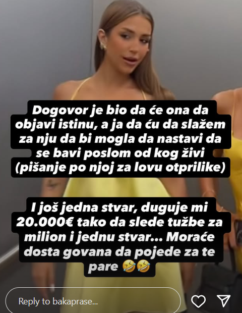 „Dogovor je bio da će ona da objavi istinu, a ja da ću da slažem za nju da bi mogla da nastavi da se bavi poslom od kog živi. I još jedna stvar, duguje mi 20.000 evra tako da slede tužbe za milion i jednu stvar… Moraće dosta go*ana da pojede za te pare“, napisao je jutjuber, nakon čega se obratio i svojim fanovima.