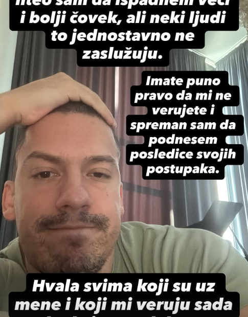 „Izvinite što sam vas slagao, hteo sam da ispadnem veći i bolji čovek, ali neki ljudi to jednostavno ne zaslužuju. Imate puno pravo da mi ne verujete i spreman sam da podnesem posledice svojih postupaka. Hvala svima koji su uz mene i koji mi veruju sada kada je trend da se napada ‘Baka Prase’.“