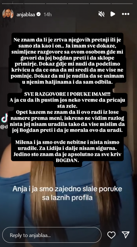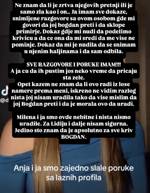 „Ne znam da li je žrtva njegovih pretnji ili je samo zla kao i on… Ja imam sve dokaze, snimljene razgovore sa ovom osobom gde mi govori da joj Bogdan preti i da sklope primirje. Dokaz gde mi nudi da podelimo krivicu, a da će ona da mi sredi da me više ne pominje. Dokaz da mi je nudila da snimam u njenim haljinama i da odbila“, napisala je ona, nakon čega je spomenula i Milenu, ali i ko je po njenom mišljenju glavni krivac u celoj priči.