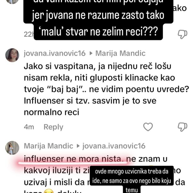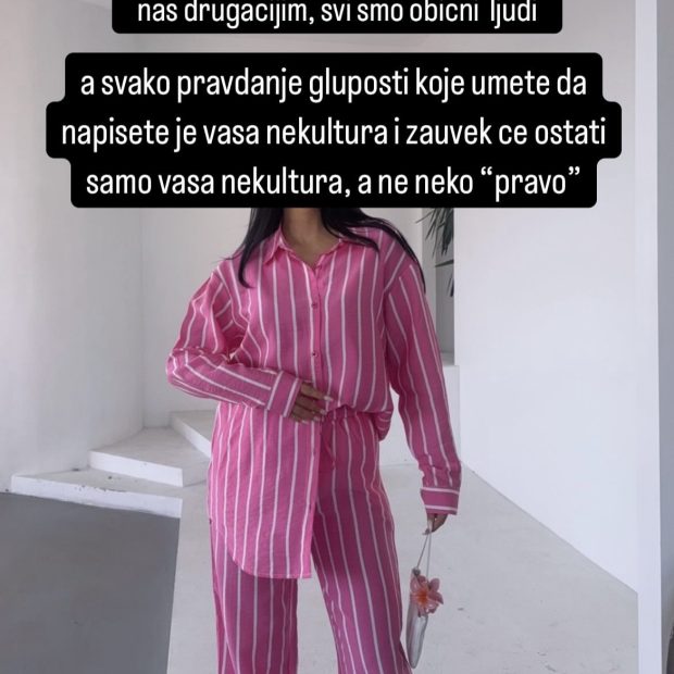 „Ljudi, ja sam influenser ja MORAM da vam kažem termin porođaja, jer Jovana ne razume zašto tako ‘malu’ stvar ne želim reći??? Vaše je pravo da pitate, naše da odgovorimo ili ne odgovorimo i to je to, ali ovaj bezobrazluk vi MORATE… To što ja ili neko drugi snima, ne pravi nas drugačijim, svi smo obični ljudi. A svako pravdanje gluposti koje umete da napišete je vaša nekultura i zauvek će ostati samo vaša nekultura, a ne neko ‘pravo'“, napisala je ona.