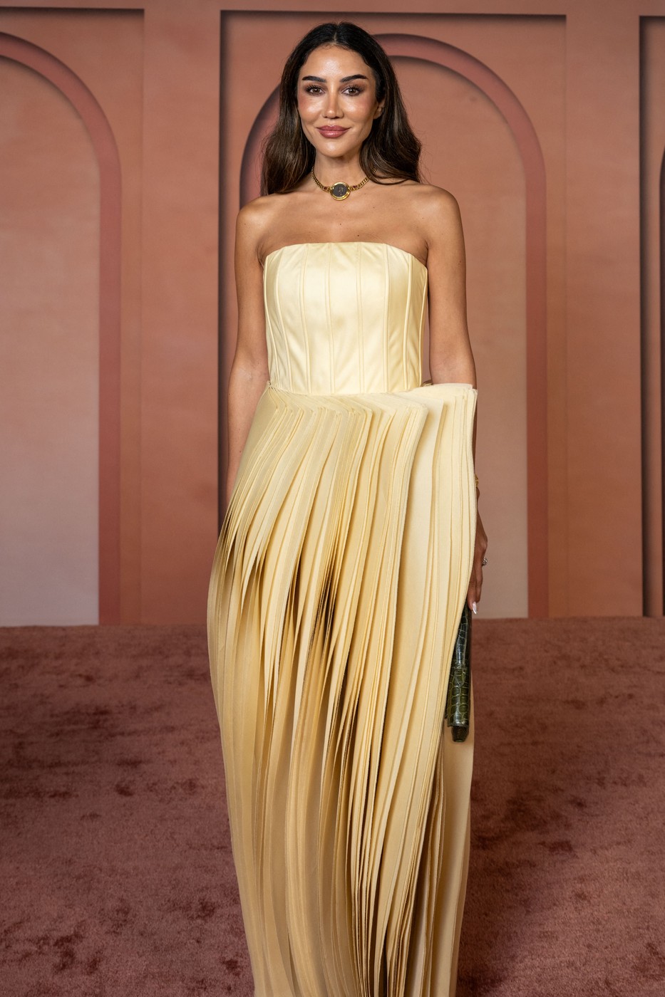 Stajling je upotpunila zlatnim sandalama sa kaišićima i masivnom ogrlicom sa medaljonom koja je dodatno pojačala dramatičan utisak. Frizura zalizana, kosa puštena niz leđa, dok je šminka bila suptilna, u prirodnim tonovima – taman toliko da istakne njene crte lica.