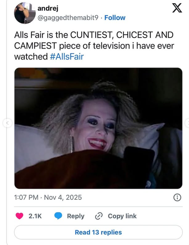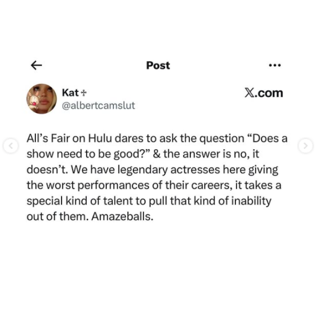 „Da li ste se uključili u najhvaljeniju seriju godine!?!??!“ našalila se ona na Instagramu 6. novembra, dva dana nakon premijere. „’All’s Fair’ s strimuje sada na @hulu i @disneyplus.“