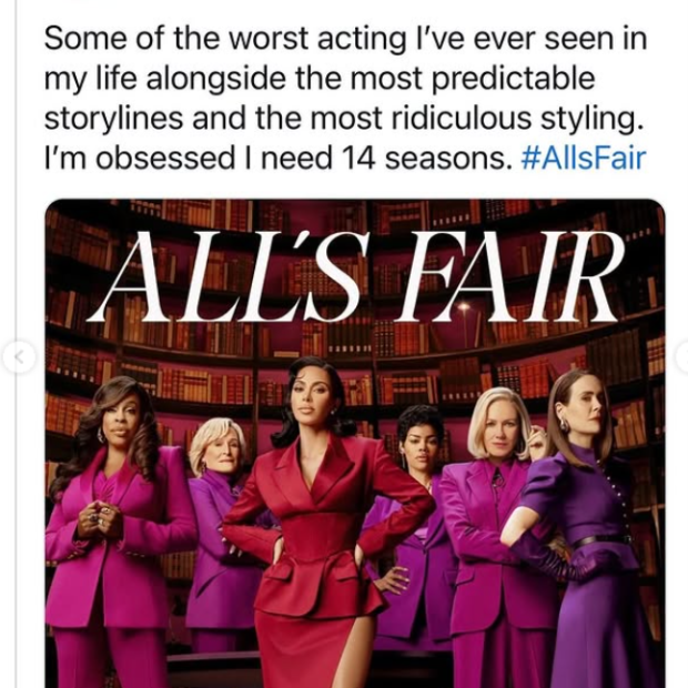 Striming servis Hulu je odlučio da obnovi seriju „All’s Fair“ – svoju od kritike loše ocenjenju dramu u kojoj glume Kim Kardašijan, Sara Polson, Glen Kluoz, Nisi Neš-Bets, Naomi Vots i Tejana Tejlor – za drugu sezonu, a zvanična objava je okačena na društvene mreže 24. novembra.