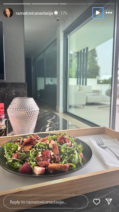 Mlada pevačica je potom na svom Instagram storiju objavila i jednu fotografiju iz unutrašnjosti kuće. Ona je uslikala svoj obrok i tom prilikom su njeni pratioci mogli da vide delić crnog mermernog stola, kao i sivi zid koji je takođe ukrašen crnim mermerom.