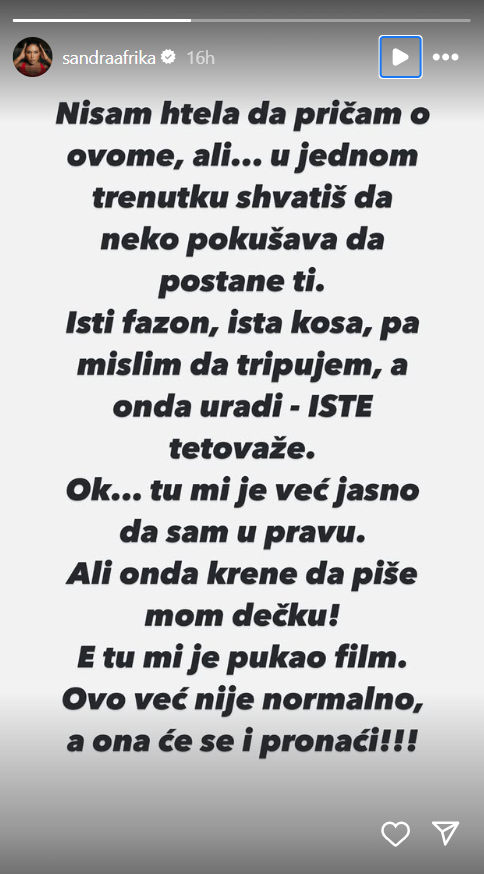 „Nisam htela da pričam o ovome, ali… U jednom trenutku shvatiš da neko pokušava da da postane ti. Isti fazon, ista kosa, pa mislim da tripujem, a onda uradi iste tetovaže! Ok… Tu mi je već jasno da sam u pravu. Ali onda krene da piše mom dečku! E, tu mi je pukao film! Ovo već nije normalno, a ona će se pronaći“, napisala je Sandra na storiju.