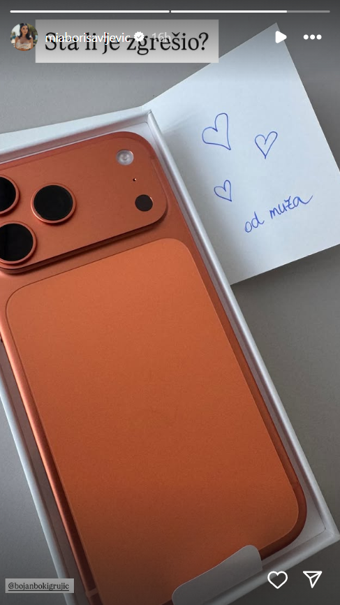 Naime, nju je na stolu sačekao najnoviji model IPhone telefona, čija cena iznosi nekoliko stotina hiljada dinara, uz poruku „Od muža“ i tri srca.