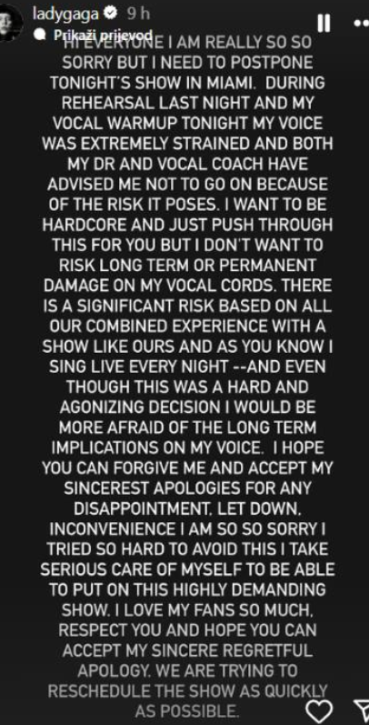 – Iako je odluka bila teška i mučna, više sam se plašila dugoročnih posledica po svoj glas. Nadam se da mi možete oprostiti i prihvatiti moje iskreno izvinjenje zbog razočaranja i neprijatnosti – poručila je Gaga.