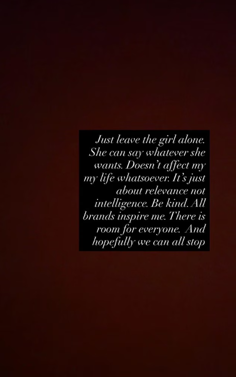 „Ostavite devojku na miru“, napisala je Selena u objavi na Instagram storiju, koju je ubrzo obrisala. „Može da govori šta god želi. To ne utiče ni najmanje na moj život. Ovde se radi o relevantnosti, ne o inteligenciji.“